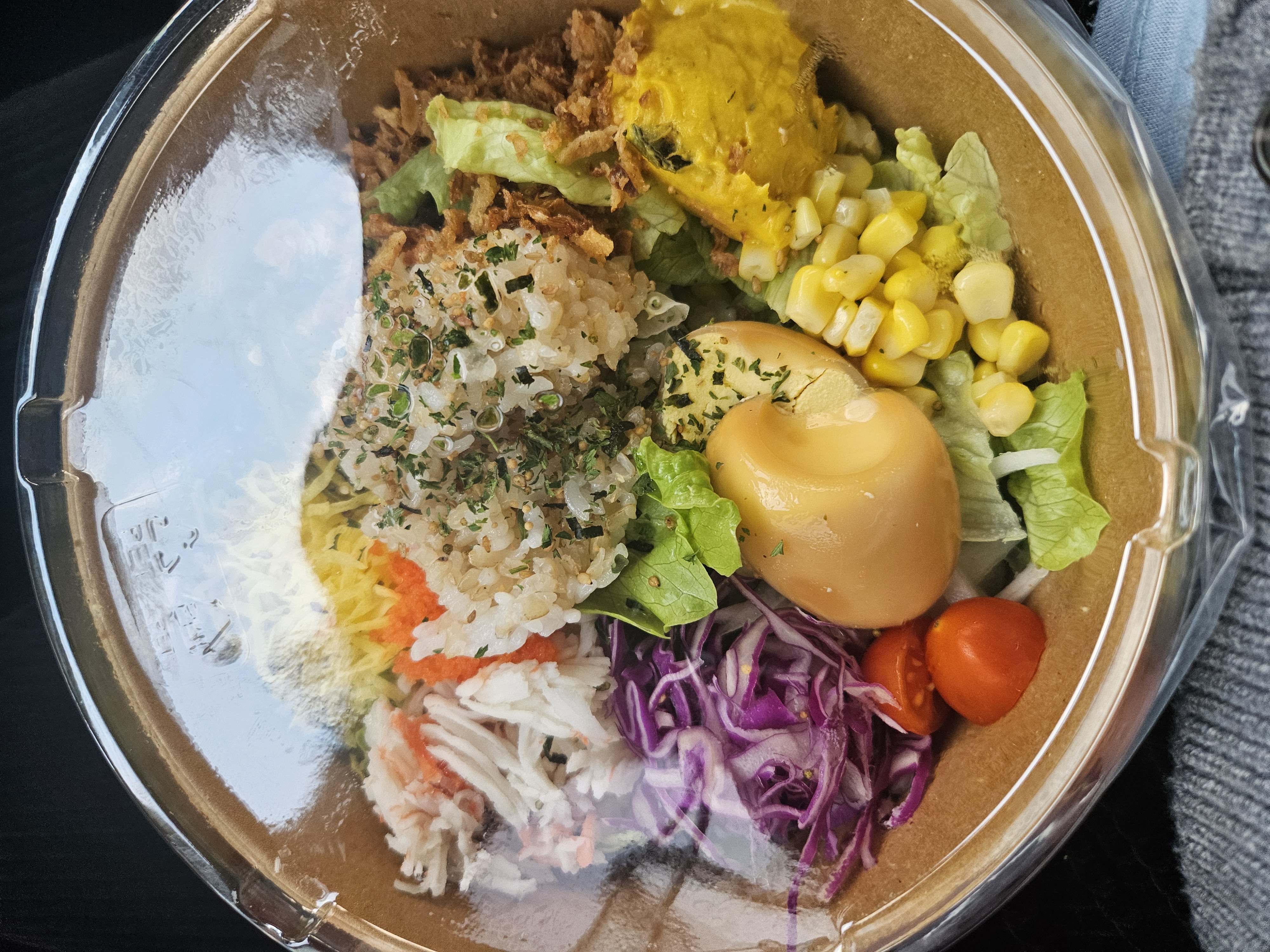 현미밥 한스쿱, 구운계란, 단호박샐러드, 야채에 소스도 선택이 가능했는데 나는 오리엔탈로!